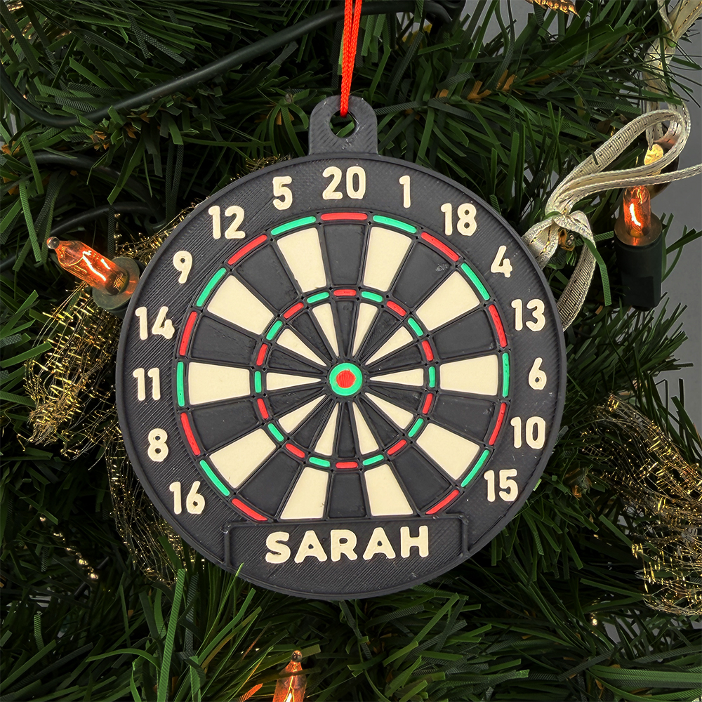 - Lieferumfang: Personalisierter 3D-gedruckte Christbaum-Anhänger im Darts-Look aus hauptsächlich PLA (Polylactide) inkl. Bändchen ohne Darts oder etwaiges abgebildetes Zubehör