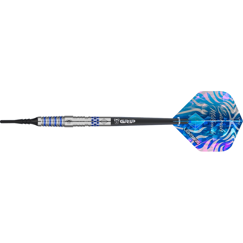 Das Design des Bull's DE Sarah Milkowski G1 Dart basiert auf den Vorlieben von Sarah Milkowski. Das Barrel ist läuft vorne spitzt zu und ist am ende zylindrisch. Über die gesamte Länge verteilen sich drei markante Griffzonen: eine große mit Ringgrip den an der Front, eine Mischung aus Shark und Ringgrip in der Mitte und Axialgrip nahe dem Ende. Glatte Segmente dazwischen ermöglichen eine schnelle Orientierung beim Greifen und sorgen für sicheren Halt, lassen aber dennoch etwas Spielraum für die Handposition. Das Silberne Finish mit blauen Akzenten macht den Dart zudem zu einem echten Blickfang am Board.