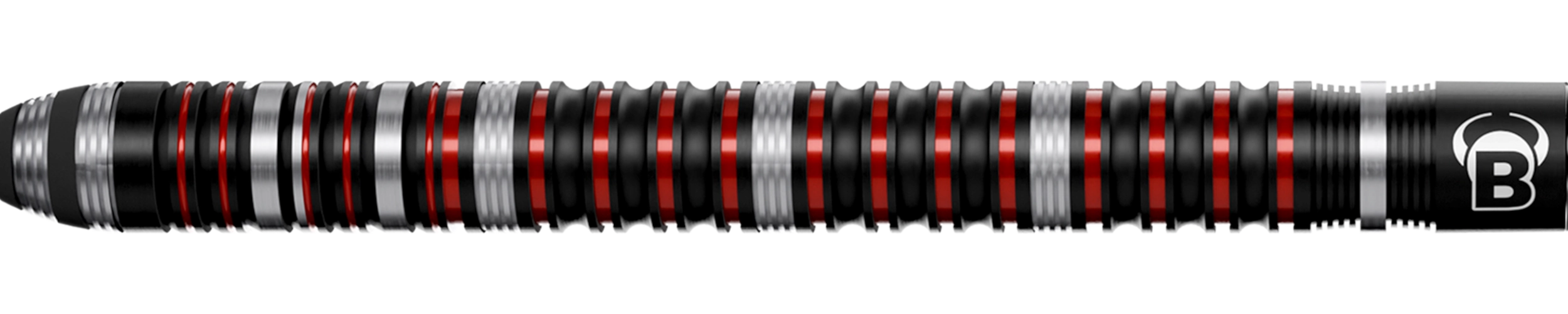 Das 60 mm lange Barrel aus 90 % Tungsten ist vollständig mit einem black coated Doppelringgrip versehen. Diese durchgehende Gripstruktur sorgt für gleichmäßigen Halt über die gesamte Barrel-Länge und unterstützt ein reproduzierbares Wurfgefühl – ideal für Spieler mit variabler Fingerposition..